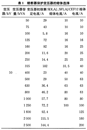 根據(jù)1989年國際配電網(wǎng)會議提供的資料,當(dāng)油浸變壓器內(nèi)發(fā)生短路故障時(shí),短路電弧會使油氣形成氣泡而占據(jù)原先屬于油的空間,油將壓力傳給變壓器外璧,隨著短路的持續(xù)而壓力愈來愈大,直到油箱炸裂。要使油箱不被炸裂,必須在20ms內(nèi)切除故障。斷路器的動作時(shí)間是保護(hù)動作時(shí)間和斷路器固有動作時(shí)間兩部分之和,其值不小于60ms,可見斷路器不能達(dá)到保護(hù)油浸變壓器的目的。負(fù)荷開關(guān)+熔斷器環(huán)網(wǎng)柜則能夠有效地保護(hù)變壓器,熔斷器保護(hù)變壓器的熔體選擇表1。